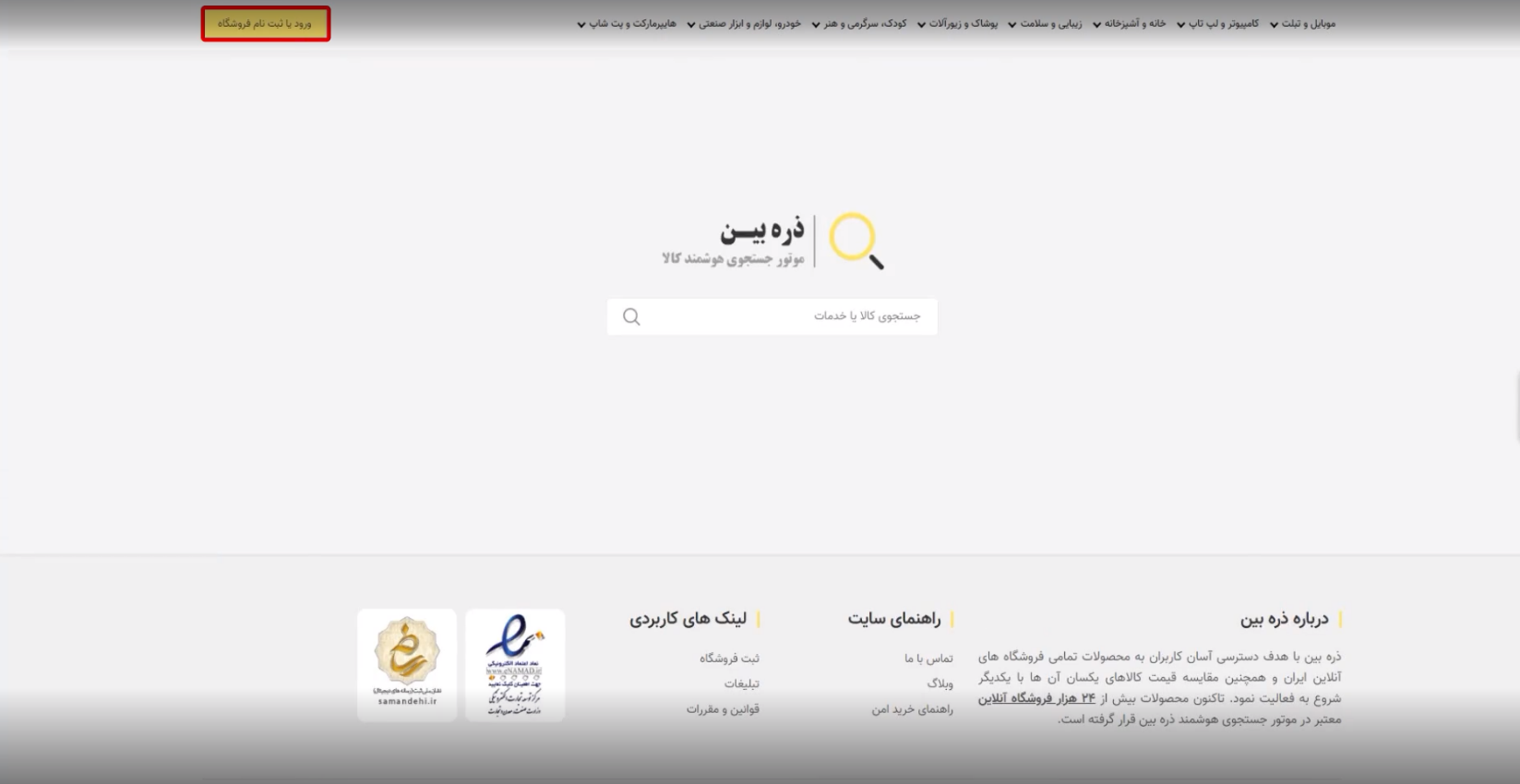 برای ثبت سایت باید در ذرهبین حساب کاربری داشته باشید. بنابراین در صفحه اصلی بر روی دکمه ورود یا ثبت نام فروشگاه کلیک کنید.