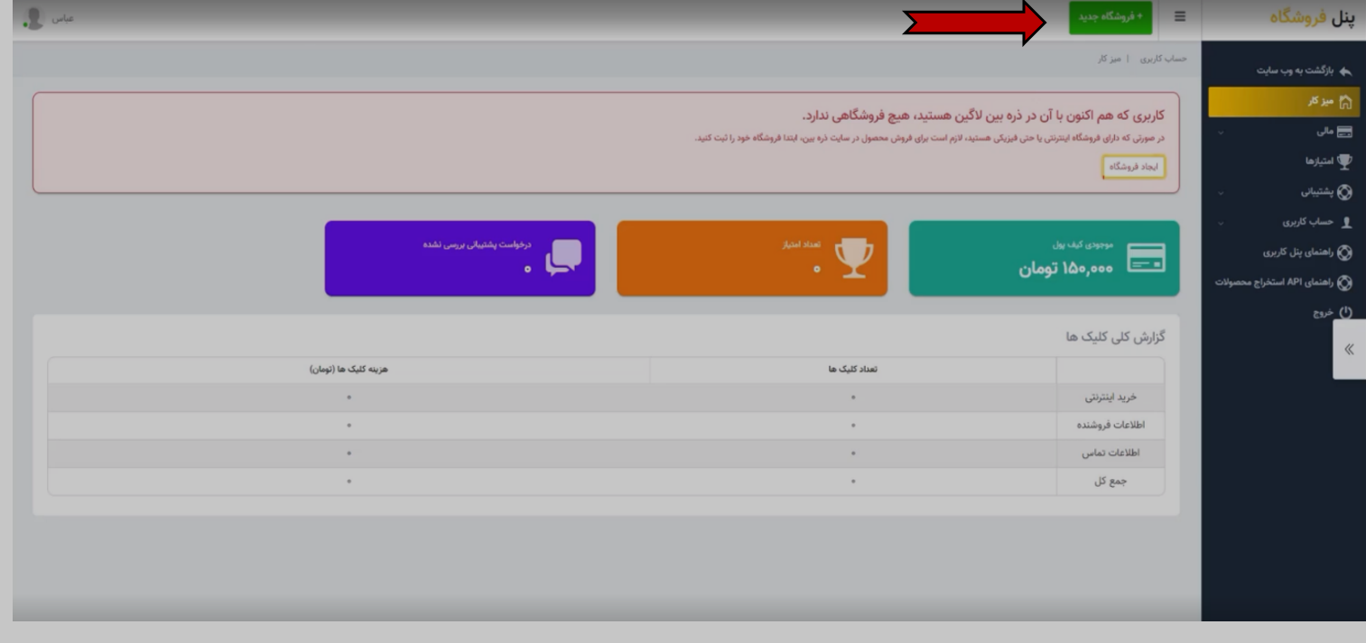 پس از تایید کد پیامکی طبق تصویر، پنل مدیریتی ذره بین نمایش داده می شود. از قسمت دکمه فروشگاه جدید اقدام به ثبت وب سایت فروشگاهی خود نمائید.