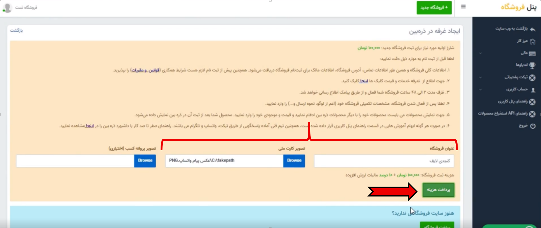 در صورتی انتخاب گزینه ی سایت ندارم به صفحه ی زیر هدایت می شوید. پس از درج عنوان فروشگاه و آپلود تصویر کارت ملی خود بایستی پرداخت هزینه ی مربوط به ثبت در سایت ذره بین را متقبل شوید و بر روی پرداخت هزینه کلیک کنید تا به صفحه پرداخت هدایت شوید.