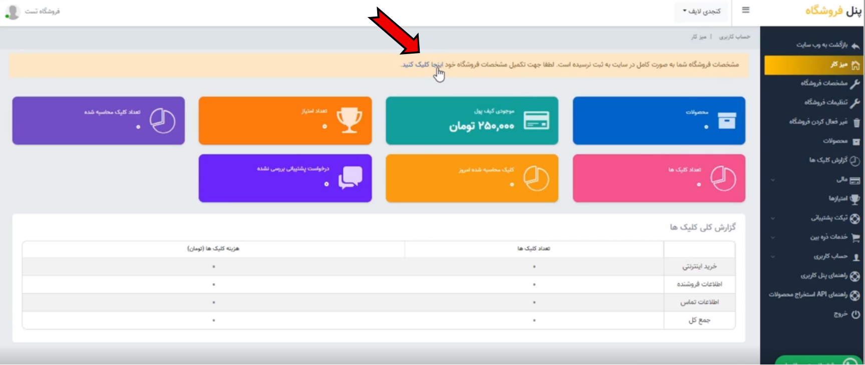 پس از تایید فروشگاه می بایست مشخص فروشگاه خود را کامل نمائید . بدین منظور از جعبه ابزار سمت راست بر روی میز کار کلیک کرده و طبق تصویر بر روی عبارت اینجا کلیک نمایید کلیک کرده و اطلاعات فروشگاه خود را ثبت نمایید.