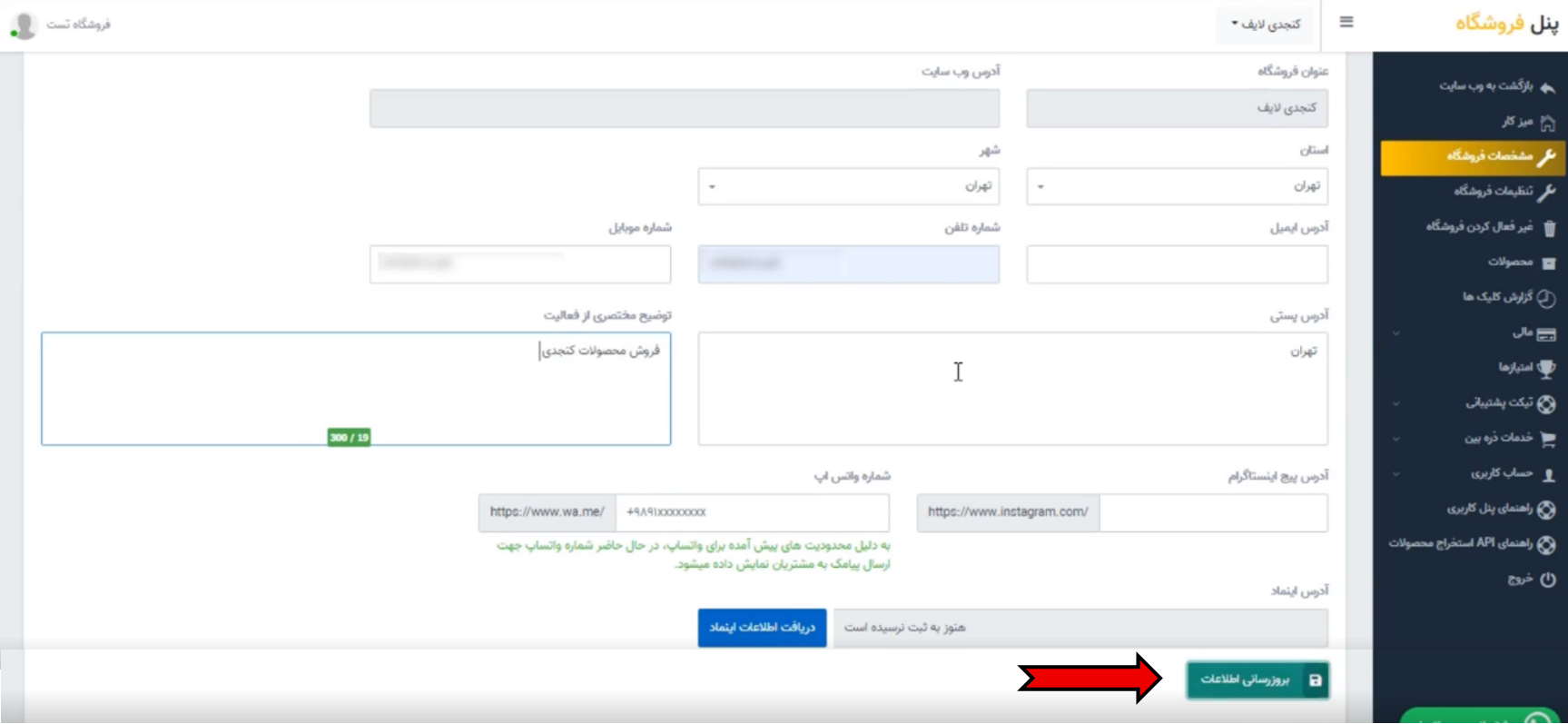 در ادامه صفحه ی جدیدی گشوده می شود که بایستی اطلاعات در خواستی مربوط به عنوان فروشگاه ، آدرس وب سایت، استان و شهر و آدرس ایمیل، شماره موبایل، تلفن ثابت و سایر اطلاعات درخواستی را وارد کرده و بر روی دکمه ی بروزرسانی اطلاعات را جهت ذخیره اطلاعات کلیک می کنیم.