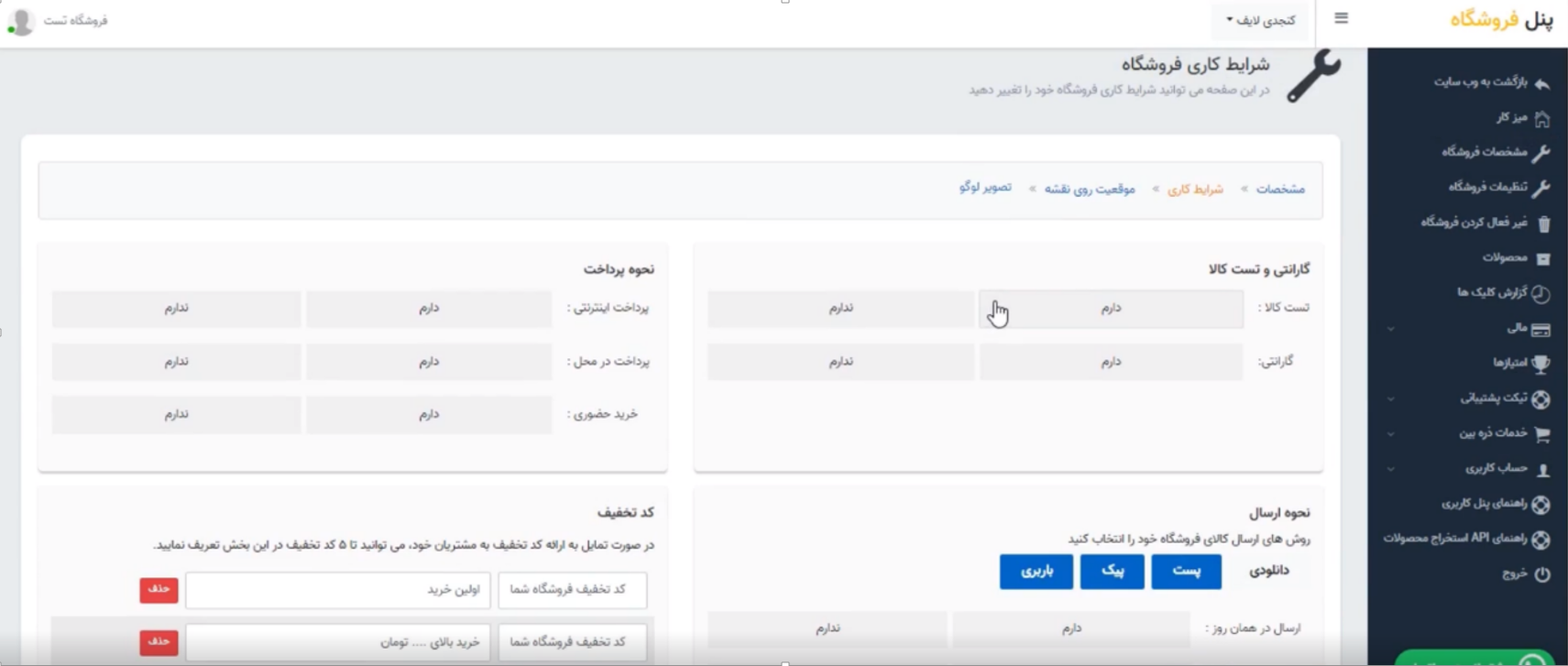 در مرحله بعد شرایط کاری فروشگاه خود ائم از : دارا و یا عدم گارانتی و تست کالا، نحوه ی پرداخت فروشگاه (حضوری، آنلاین، پرداخت در محل)، نحوه ی ارسال (دانلودی، پست، پیک، باربری)، کد تخفیف فروشگاه را درج نموده سپس بر روی بروز رسانی اطلاعات کلیک کنید.