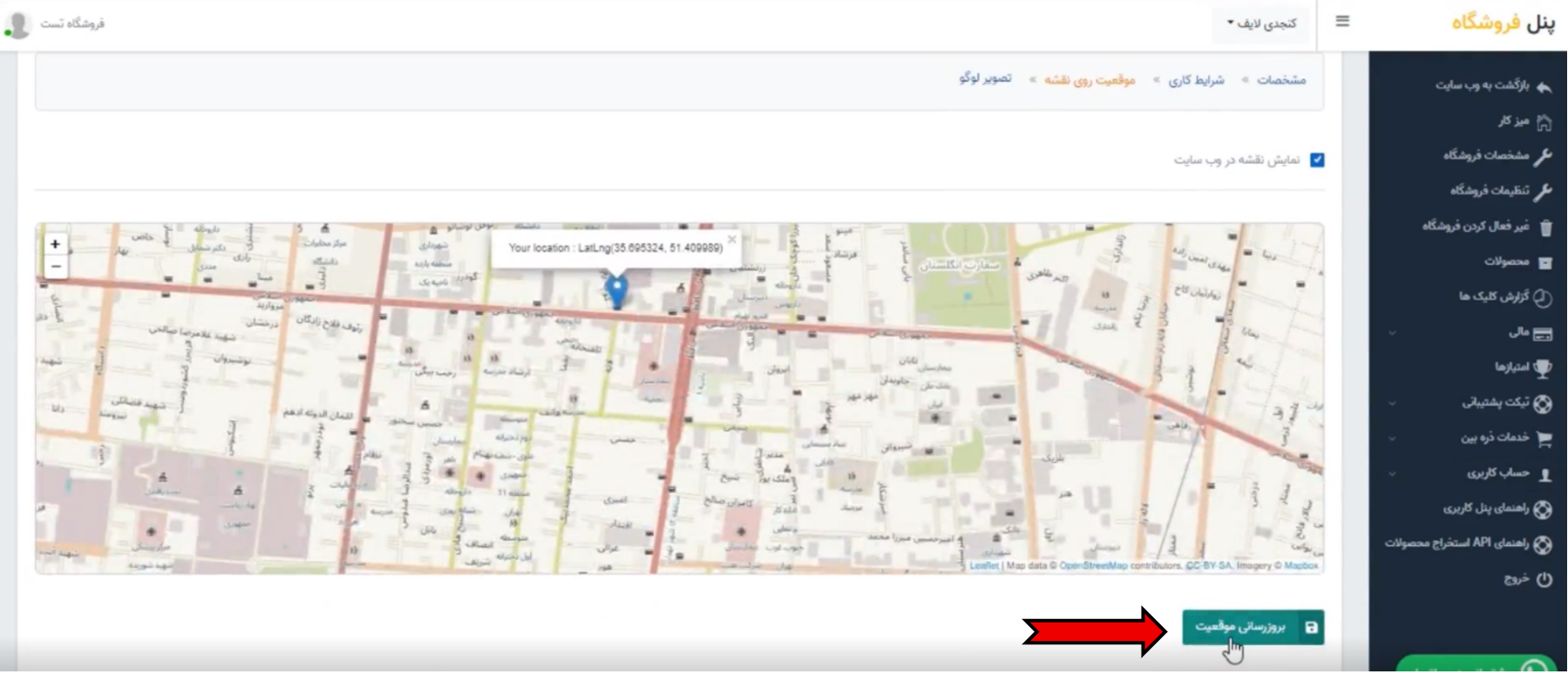 پس از مشخص کردن آدرس بر روی نقشه همانند تصویر زیر بر روی دکمه بروز رسانی موقعیت کلیک می کنیم.