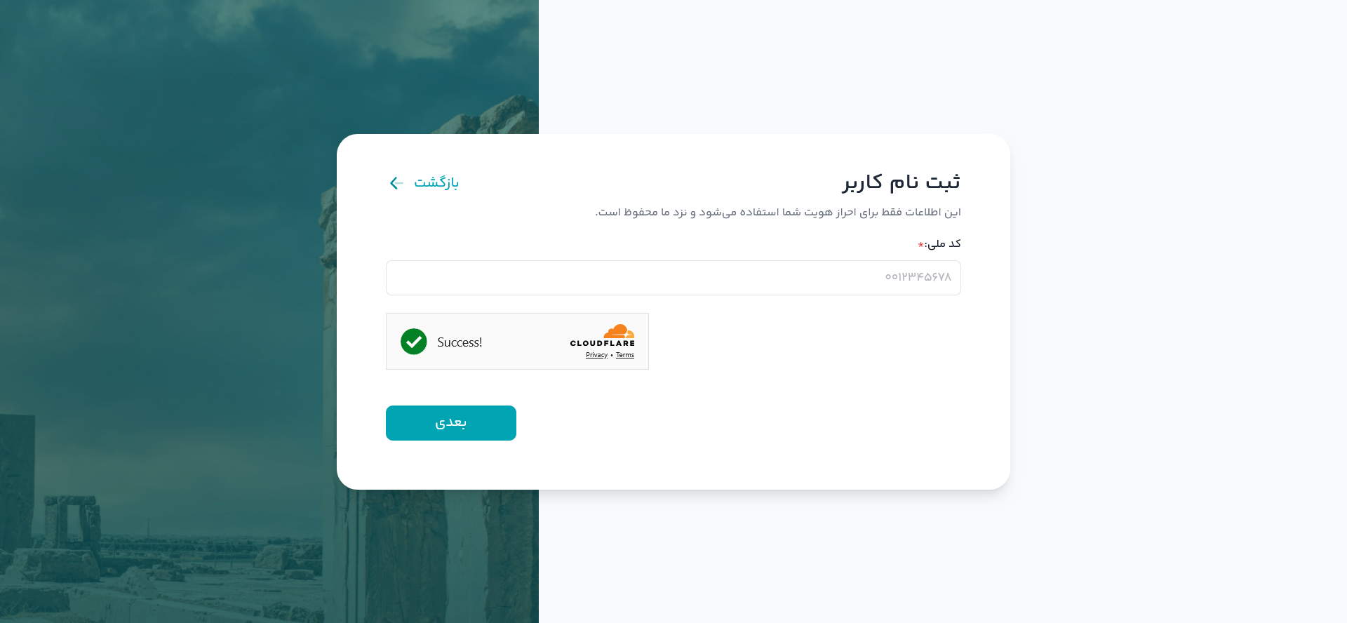 در مرحله ی بعد بایستی کد ملی خود را درج نمائید. (در صورتی که قبلأ در سامانه ثبت نام به عمل آورده باشید با خطای ثبت تکراری کد ملی مواجه خواهید شد).